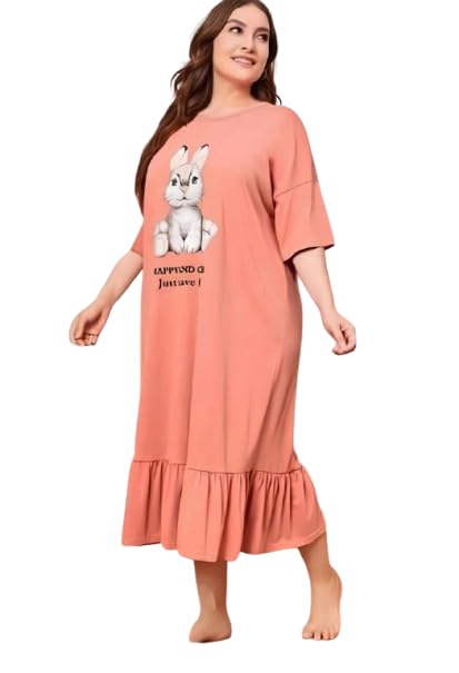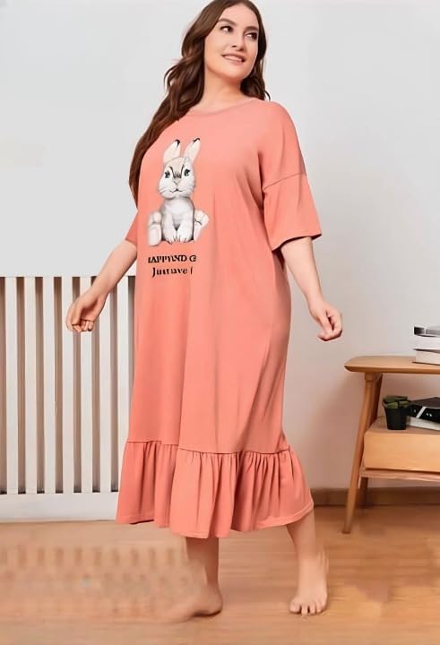 Generic - كاش قطن للنساء – تصميم واسع ومريح بطبعة أرنب لطيفة مع كشكشة سفلية – ملابس منزلية ناعمة مقاس وان سايز .
