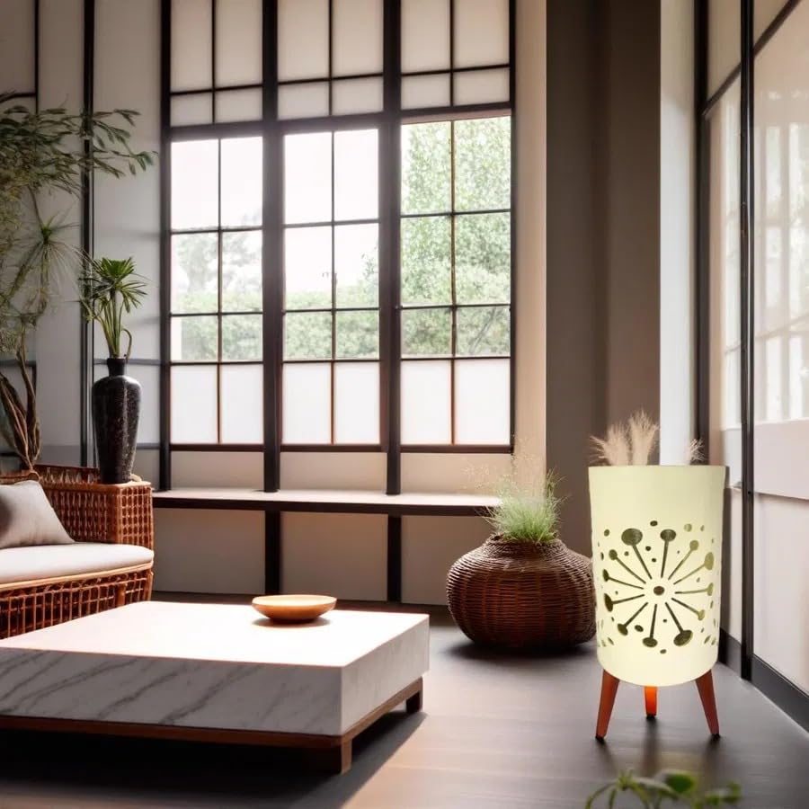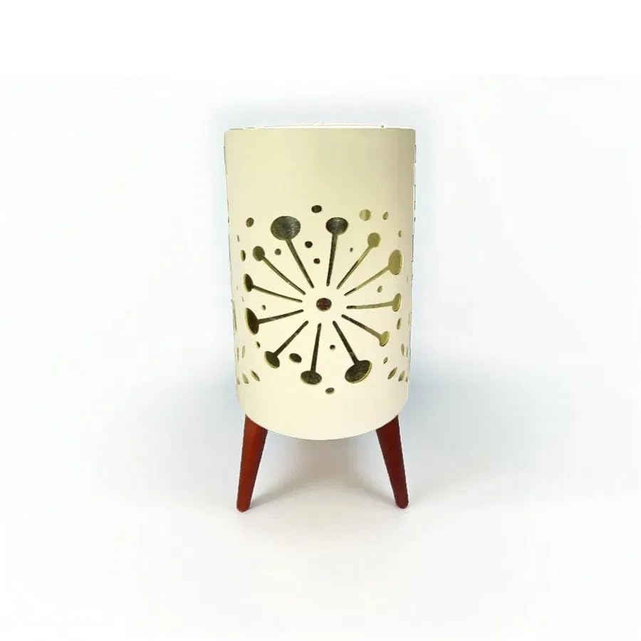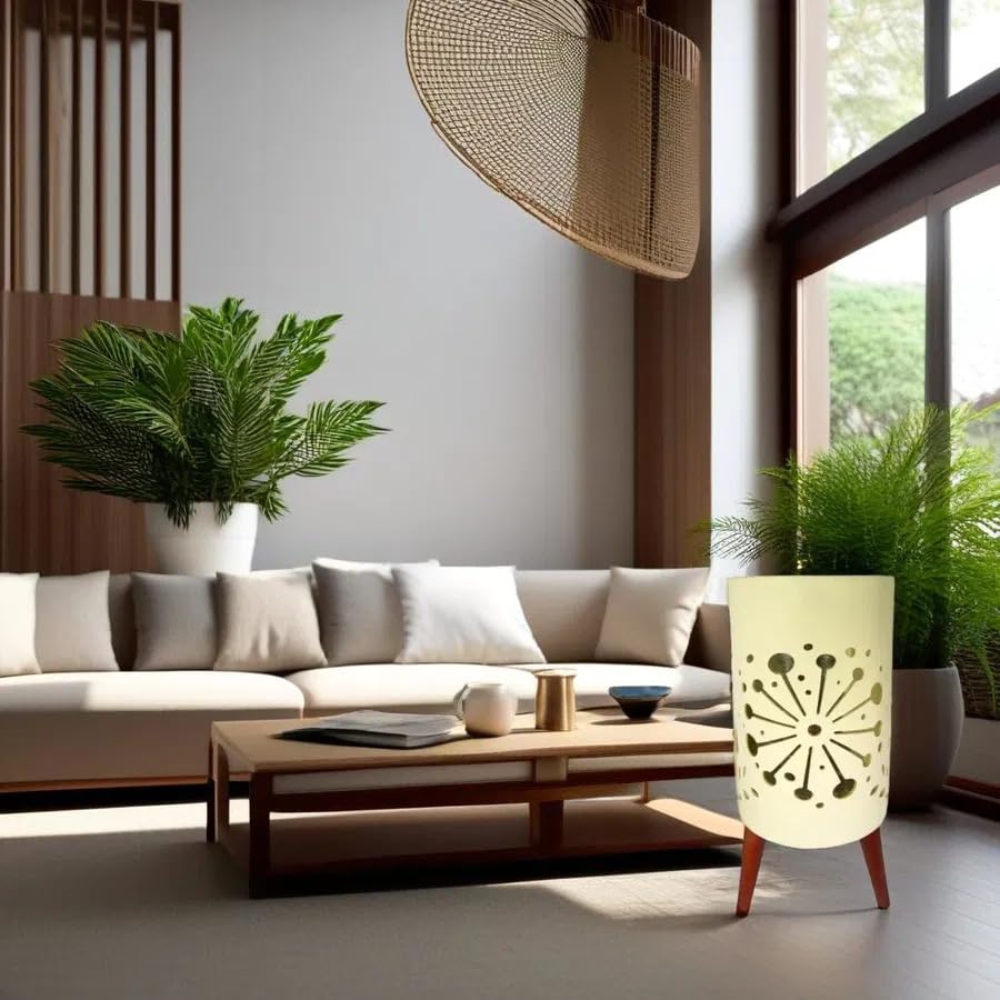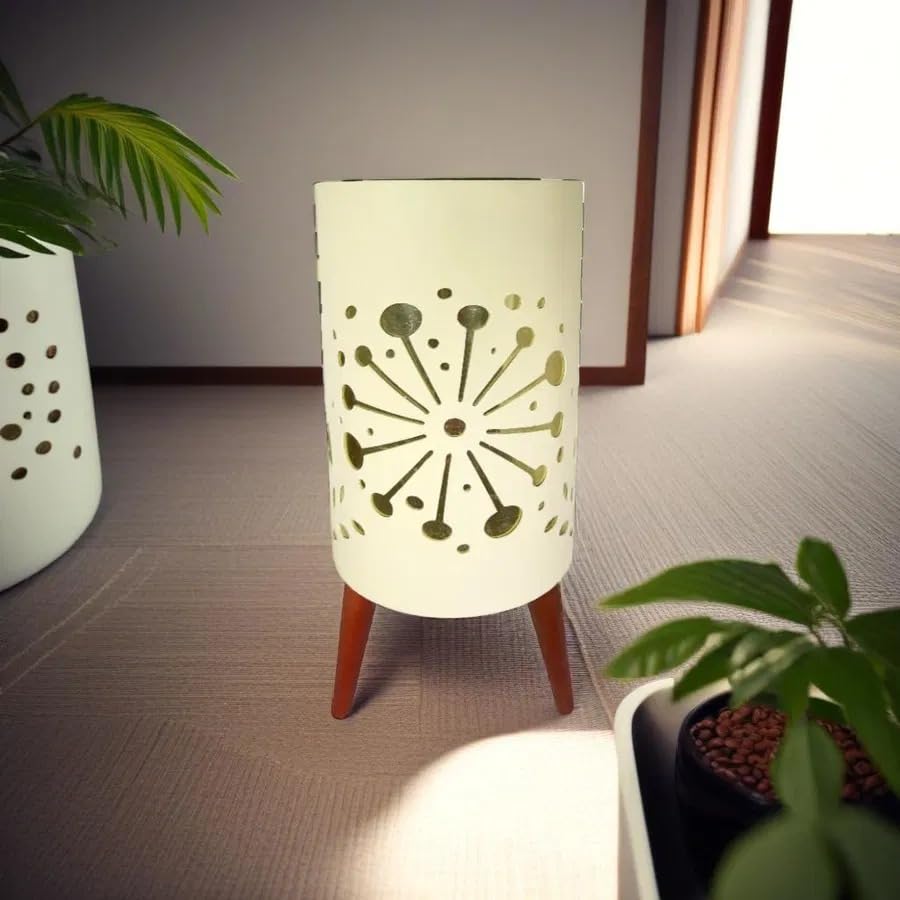 Generic - أصيص زرع صناعي أسطواني كريمي مع زخارف دائرية مفرغة، أرجل خشبية بنية، تصميم عصري منتصف القرن، ديكور منزلي أنيق