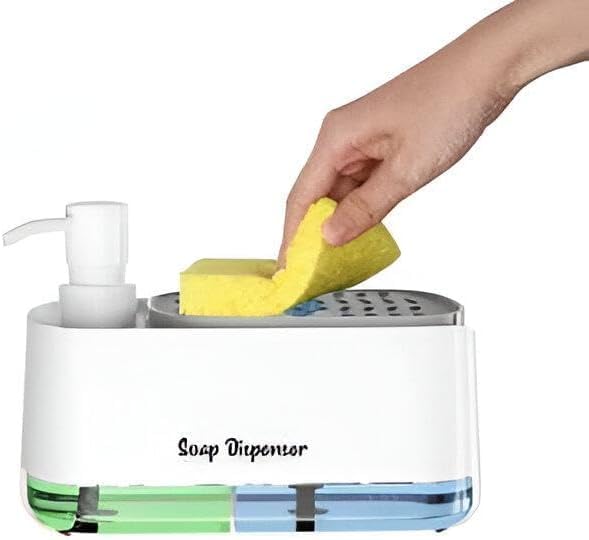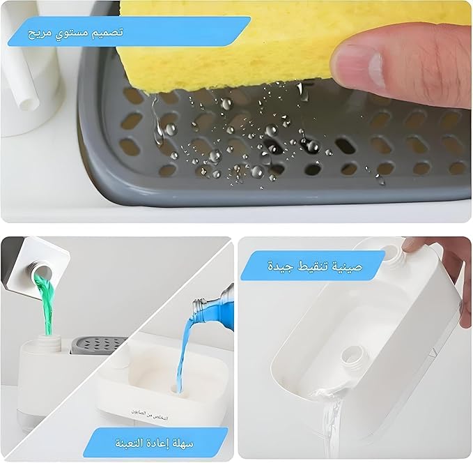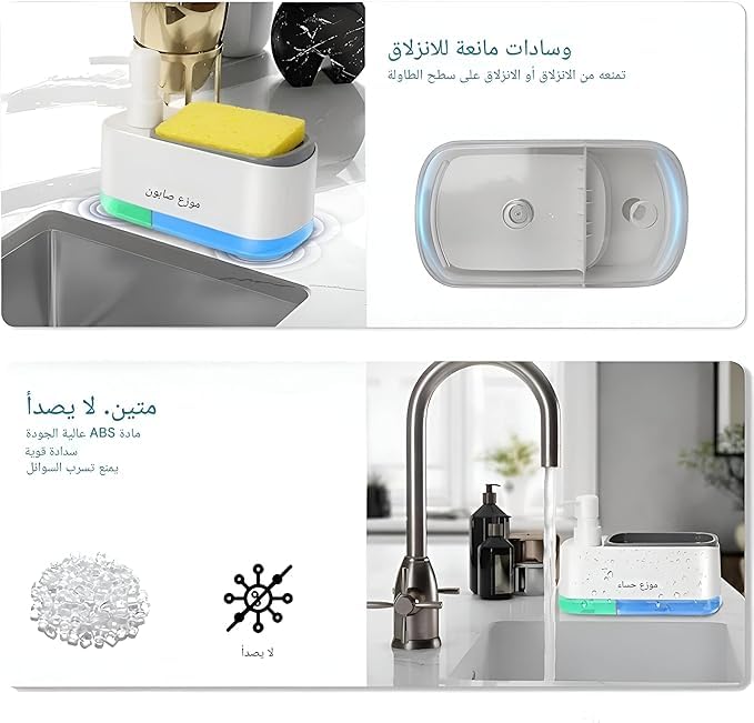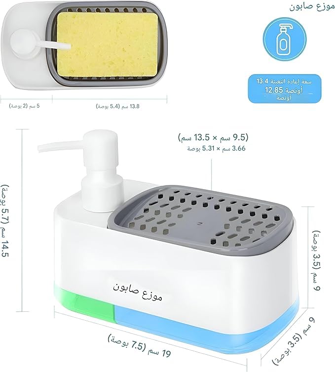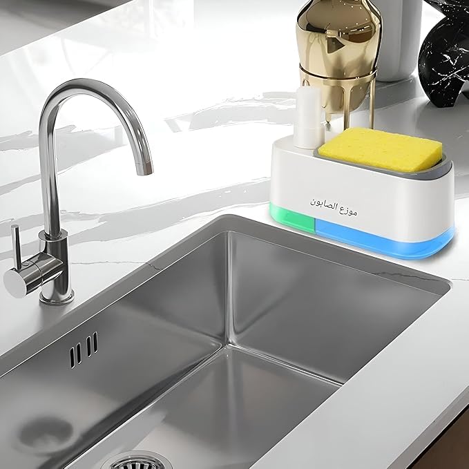 - ١) تصميم مبتكر: موزع صابون ذكي مع حامل إسفنج مدمج، مصمم بأبعاد مثالية ١٤ × ١٠ × ٨.٥ سم للاستخدام المريح في المطبخ