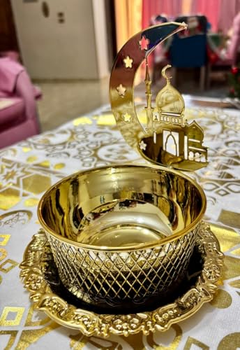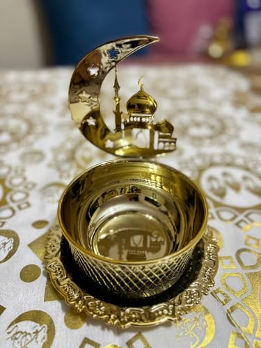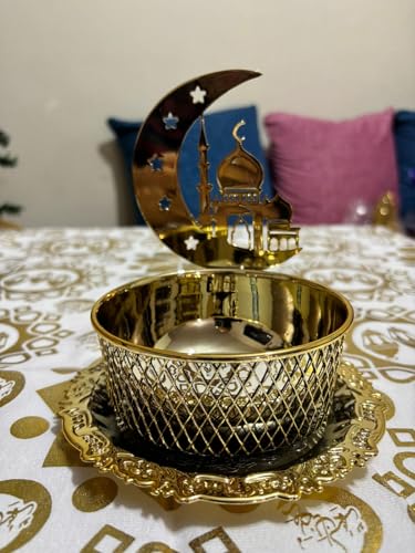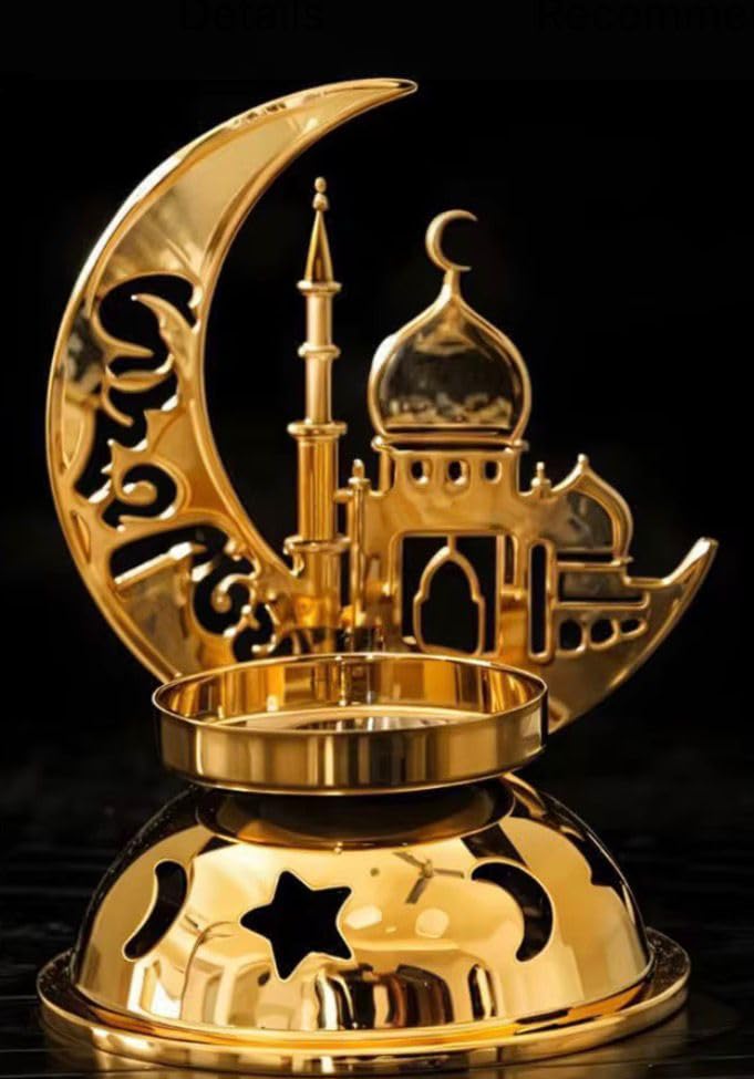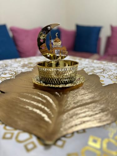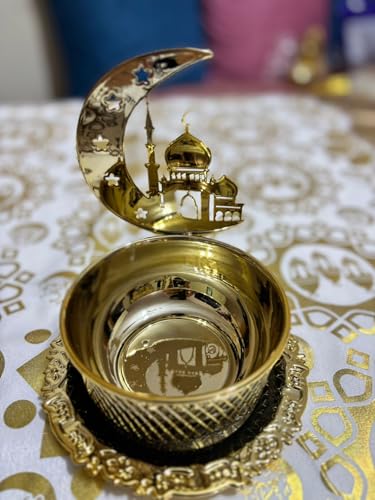 Generic - مبخرة فاخرة بتصميم الهلال والمسجد، ذهبية اللون مع صحن زخرفي، ديكور إسلامي