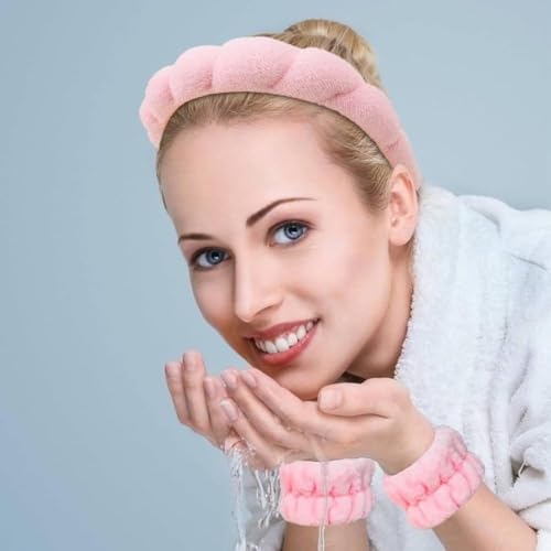 CRIYALE - شريط راس للوجه والمنتجعات الصحية للنساء من كرييل | اسفنجة ناعمة للعناية بالبشرة والمكياج وغسل الوجه بشكل زهرة عباد الشمس مع 2 رباط معصم | شريط شعر للعناية بالبشرة (بينك)