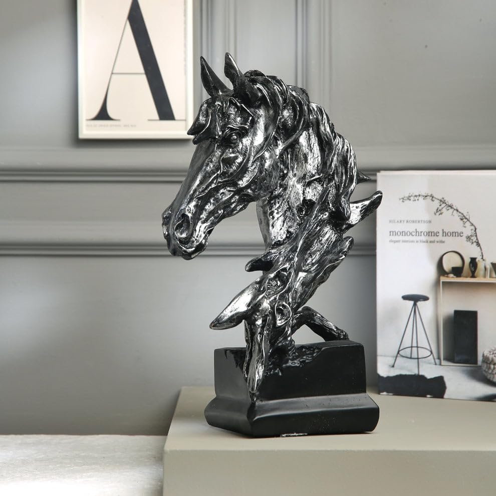 • التصميم: تمثال رأس حصان لافت يتميز بتصميم نابض بالحركة لشعر متموج كما لو كان بفعل الرياح، بتشطيب فضي معدني محكم وقاعدة سوداء متينة.