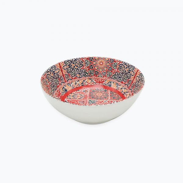 - تصميم أنيق: وعاء تقديم جميل من الميلامين يتميز بنمط ماندالا أحمر وكحلي معقد على الجزء الداخلي مع لمسة نهائية خارجية بيضاء نظيفة
