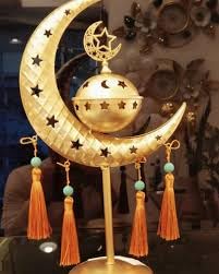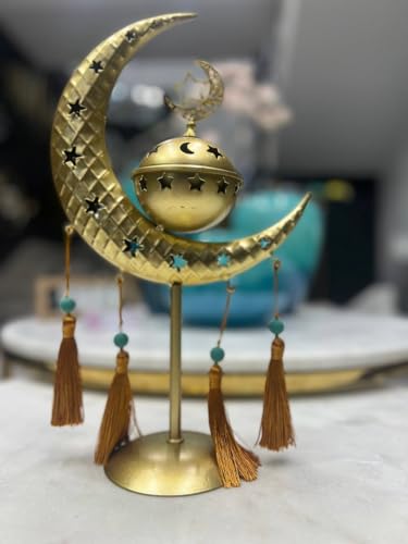 Generic - حامل شموع صغيرة مزخرف على شكل قمر ونجوم مع شراشيب، معدن ذهبي، خرز تركواز