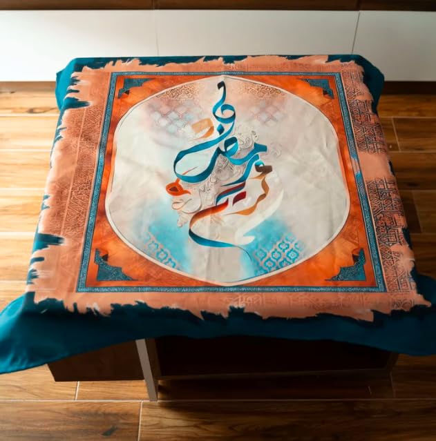 Generic - مفرش طاولة مزخرف بالخط العربي، قماش مخملي ناعم، برتقالي وازرق، متوفر بمقاسات متعددة، 90 × 90 الى 140 × 280 سم (140 × 140 سم)