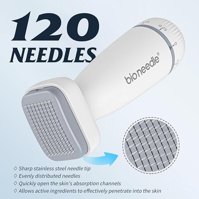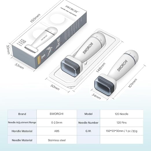 - رأس 120 إبرة للتلامس المتساوي: مصمم لتغطية متوازنة مع كل ضغطة، مما يجعل من السهل العمل على المناطق الصغيرة مثل خط الشعر أو الخدين أو منطقة الفك بدقة أفضل.