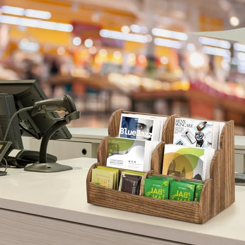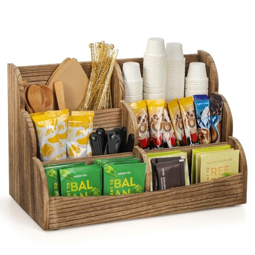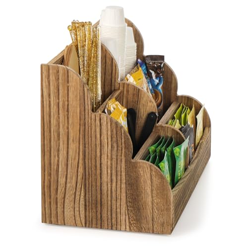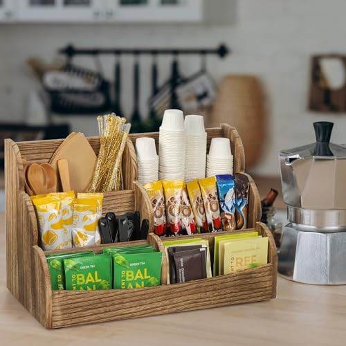 Dicunoy - منظم طاولة وركن القهوة مع حامل أكياس شاي خشب وعلبة تخزين عمودية للقهوة بتصميم ريفي 6 مساحات للمطبخ والمكتب وعبوات السكر والمحليات من ديكونوي
