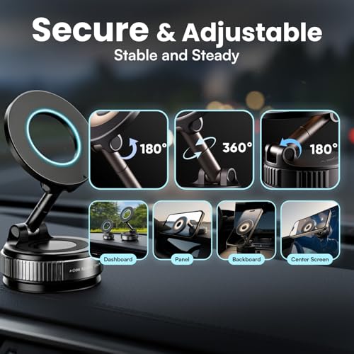 DiscoverFront - حامل موبايل مغناطيسي قوي دوار 360° يثبت على التابلوه أو زجاج مقدمة السيارة موديل 2026 ومتوافق مع ميزة ماج سيف، يحتوي على قاعدة لاصقة للتثبيت في السيارة لأجهزة آيفون وأندرويد (أسود)