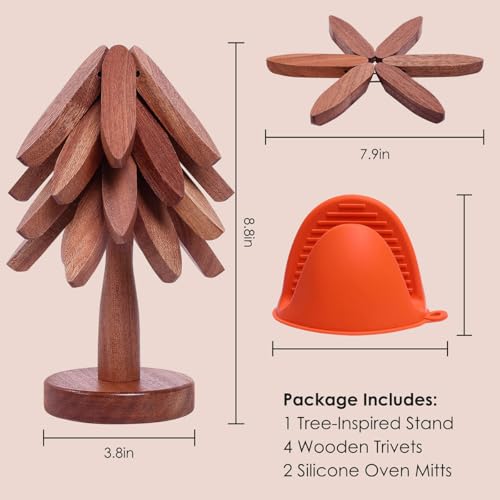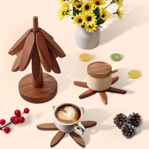 Dsathaz - مجموعة حوامل خشبية للاطباق الساخنة من دساثاز، حامل خشبي للاطباق الساخنة، مجموعة حوامل خشبية قابلة للطي للمطبخ، 4 قواعد اكواب تريفوت + 1 حامل للاطباق الساخنة (خشب الجوز)