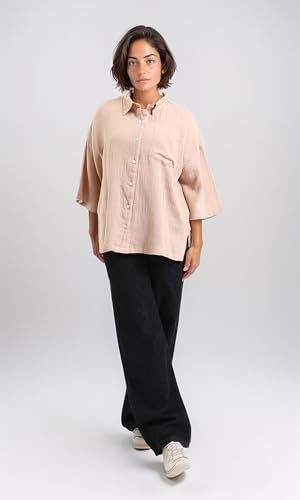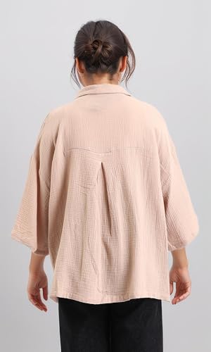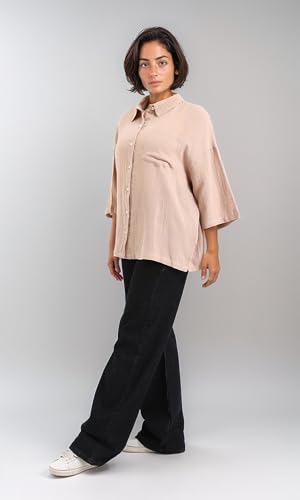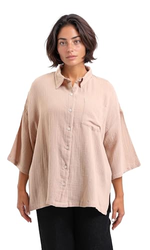 Dsisskai - قميص للنساء بأكمام متوسطة الطول وأزرار وقماش منسوج من دسيسكاي - بيج غامق عصري (عبوة من قطعة واحدة)