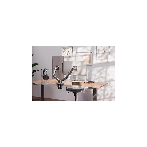 • دعم الشاشة المزدوجة: حامل ذراع زنبركي يعمل بالغاز مصمم لحمل شاشتين، مما يوفر وضعًا مرنًا لتحسين الإنتاجية وزوايا رؤية مريحة