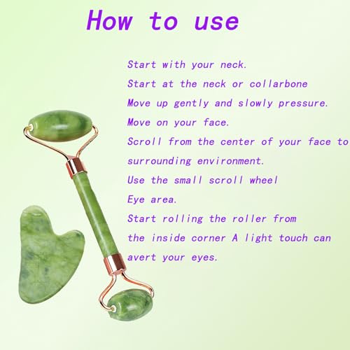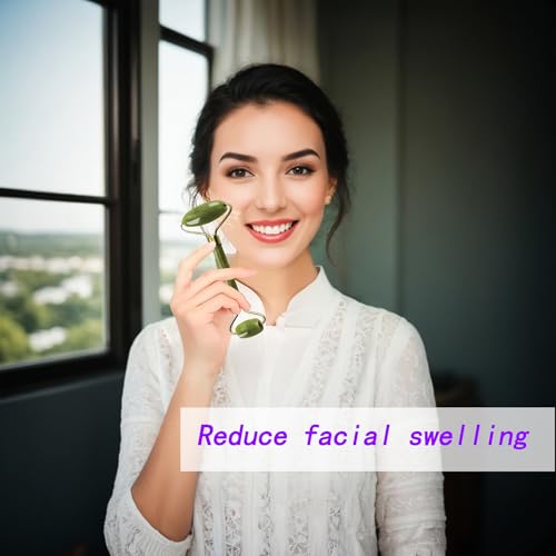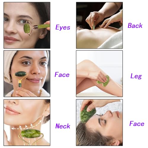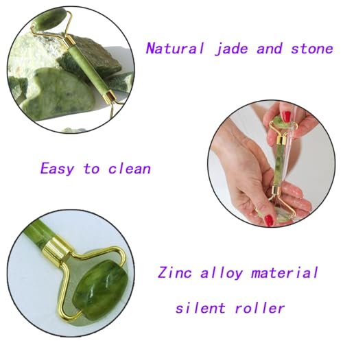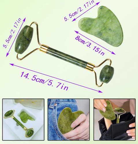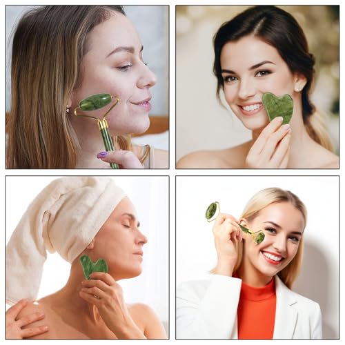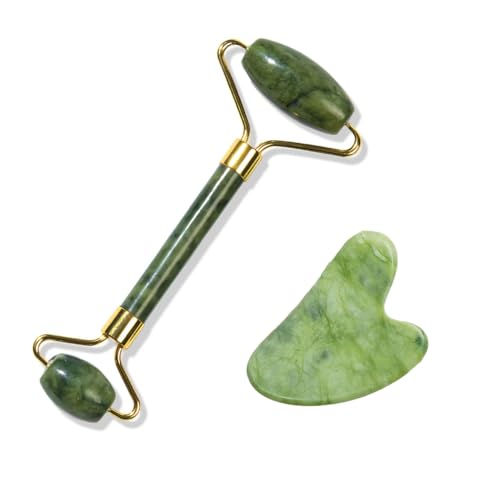 Duomama - مجموعة أدوات تجميل من بكرة يشم وأداة تدليك جوا شا من دوماما لتدليك الوجه وتجديد شباب البشرة - تقلل الانتفاخ وتعزز روتين العناية بالبشرة - هدية للعناية الذاتية للرجال والنساء - أدوات تجميل خضراء