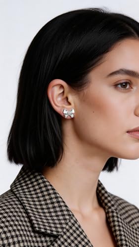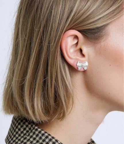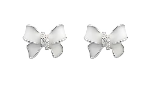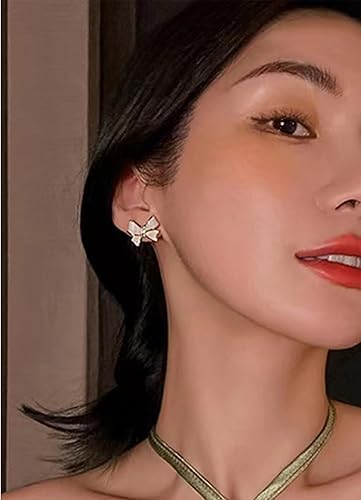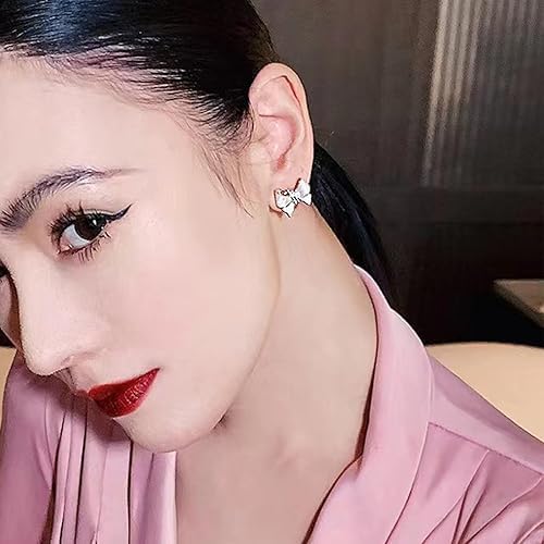 Generic - اقراط مطلية بالذهب عيار 18 قيراط من الستانلس ستيل مطلية بالذهب عيار 18 قيراط من المينا الابيض على شكل فيونكة من الزركونيا المكعب، هدية كورية للنساء