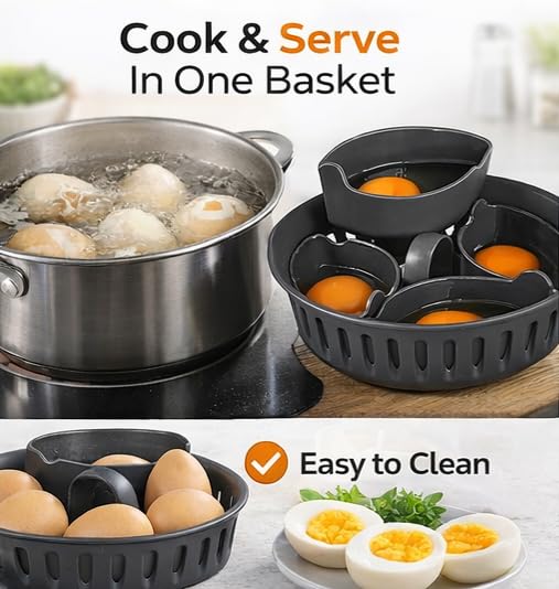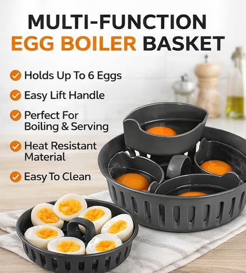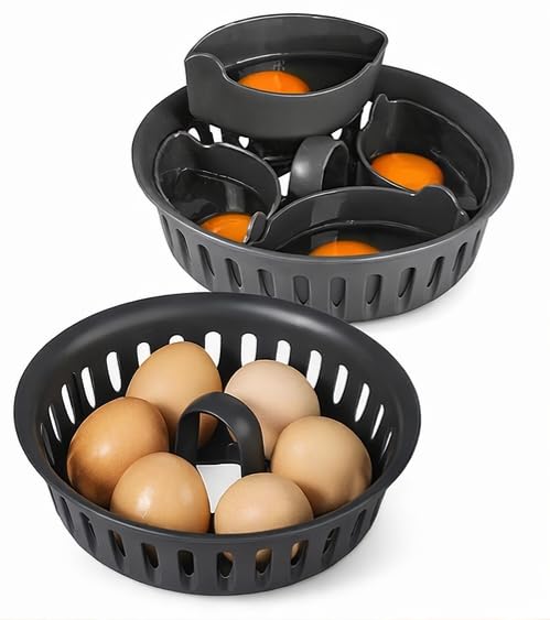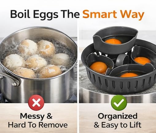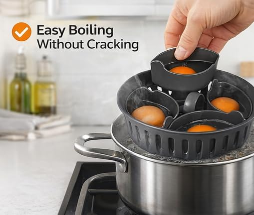 - 1️⃣ اغلي 6 بيضات في وقت واحد دون أي فوضى، اطبخ ما يصل إلى ست بيضات بالتساوي في دفعة واحدة. يحافظ الحامل المنظم على ثبات البيض أثناء الغليان للمساعدة في تقليل التشقق وجعل الطبخ أكثر تنظيمًا.