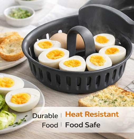 - 2️⃣ مقبض سهل الرفع للإزالة الآمنة، ما عليك سوى رفع المقبض لإزالة جميع البيض من الماء الساخن في وقت واحد. لا حاجة لغرف البيض بشكل فردي. يوفر الوقت ويحمي يديك من البخار والرذاذ