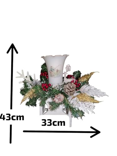 Generic - قطعة مركزية انيقة للكريسماس مع مزهرية بيضاء، ترتيب زهور العطلات مع سرخس ذهبي، توت احمر، مخاريط صنوبر، 43 × 33 سم
