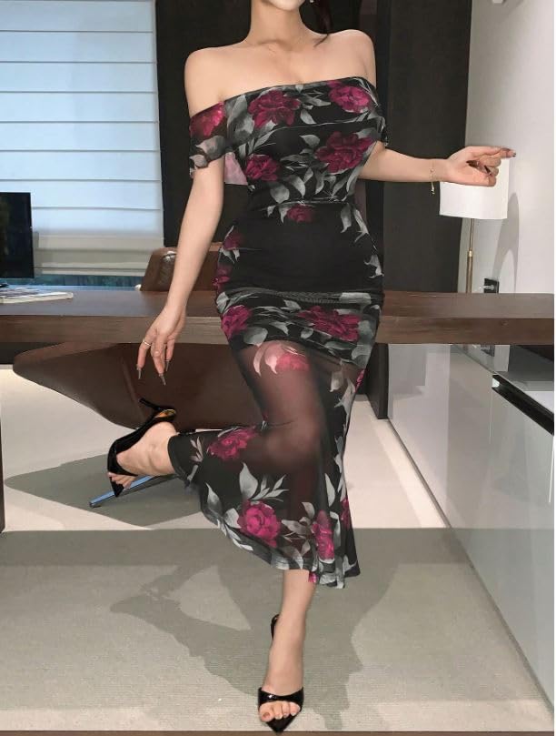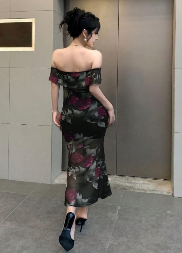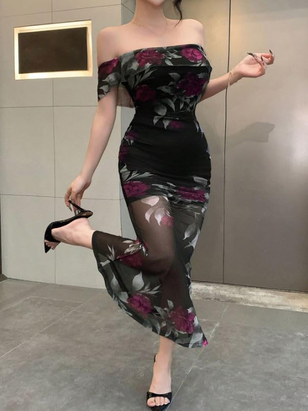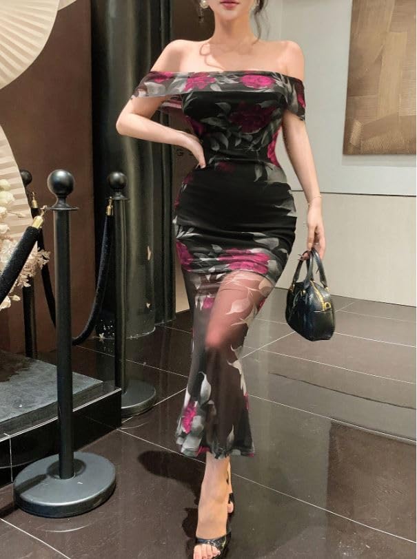 Generic - فستان سهرة انيق مكشوف الكتفين، طباعة زهور سوداء، تفاصيل شبكية شفافة، نمط ضيق ضيق، طول طويل