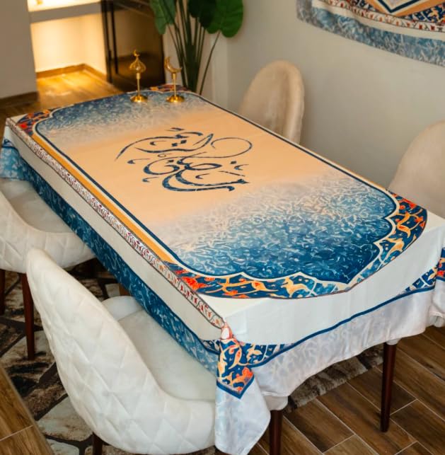 - تصميم أنيق: يتميز بعمل فني جميل للخط العربي بدرجات اللون الأزرق والبيج مع حواف هندسية مزخرفة، مما يضيف لمسة راقية وثقافية إلى مساحة الطعام الخاصة بك