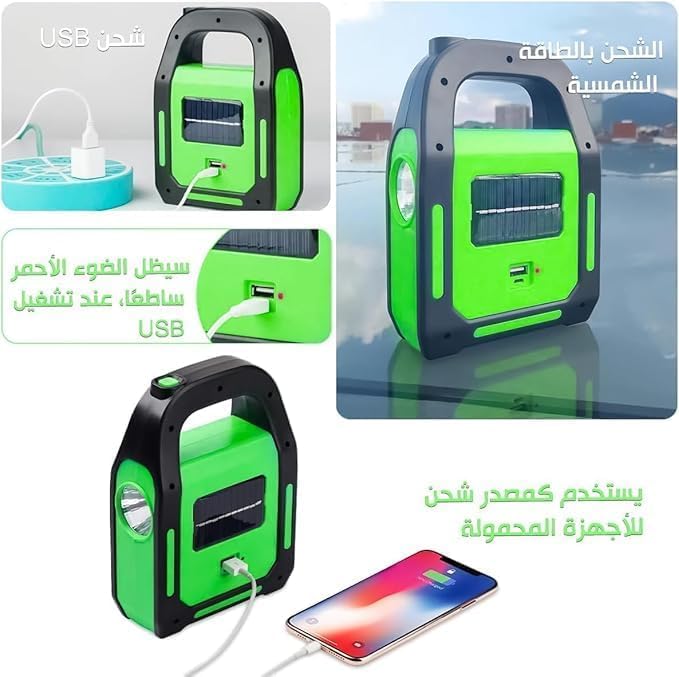 - خيارات شحن متعددة: استمتع براحة الشحن بالطاقة الشمسية وشحن USB وشحن الهاتف المحمول في حالات الطوارئ، مما يضمن لك البقاء على اتصال وإضاءة بغض النظر عن الظروف.