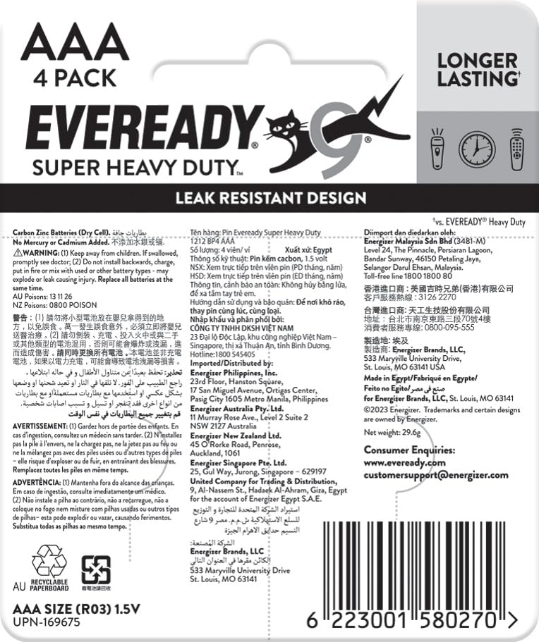 Energizer - بطارية ايفريدي فائقة التحمل، مقاس AAA، عبوة من 4 بطاريات بليستر، 1.5 فولت، كربون الزنك
