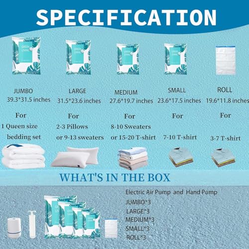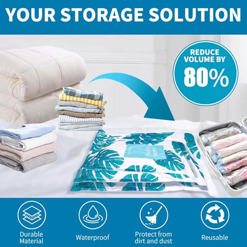 • ✅【تحسين المساحة القصوى】 يضغط كميات كبيرة من الملابس وفرش السراير والألحفة بنسبة تصل إلى 80%، ما يخلق مساحة تخزين قيمة في الخزانات والأدراج ومناطق أسفل السرير دون المساس بجودة القماش أو انتعاشه.🧺