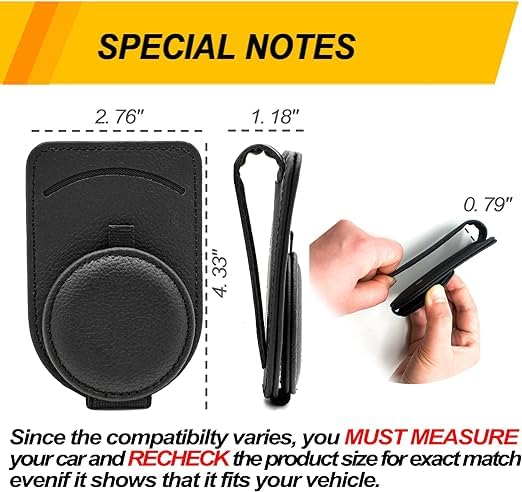 - حامل نظارة شمسية للسيارة: مشبك حامل النظارات يناسب معظم السيارات التي لا تتتجاوز سماكة الشماسة فيها 2 سم. عليك قياس واقي الشمس في سيارتك والتأكد من أن قياس الحامل يناسبها حتى لو كان يبدو كذلك.