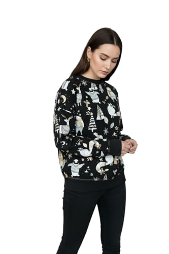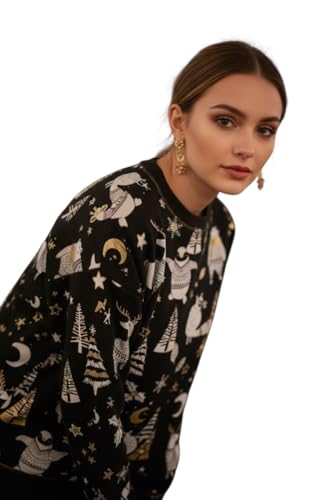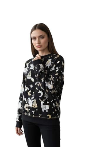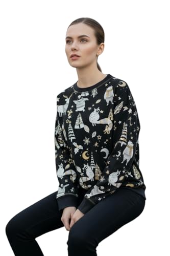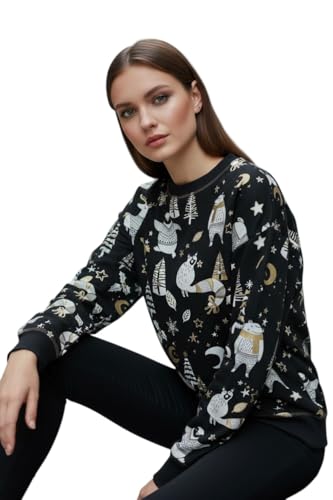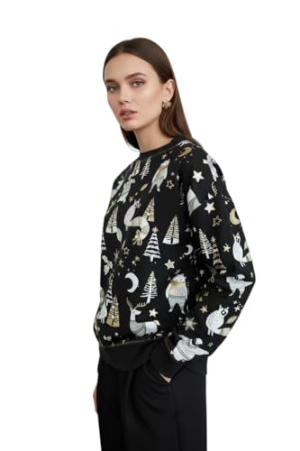 Generic - سويتشيرت شتوي أنيق، تصميم عصري بطباعة الحيوانات والنجوم، لون أسود مع رسومات فضية وذهبية المقاس متوسط