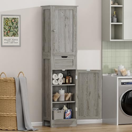 FIONESO - دولاب تخزين طويل مع درج ورفين قابلين للتعديل، خزانة حمام مع بابين، دولاب تخزين ضيق لغرفة المعيشة والحمام والمدخل والمكتب المنزلي بطول 1.7 متر من فيونيسو، لون رمادي