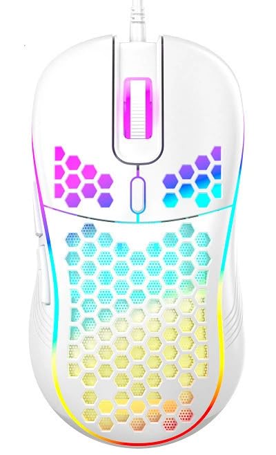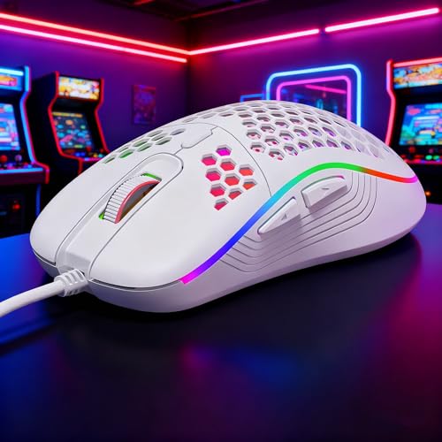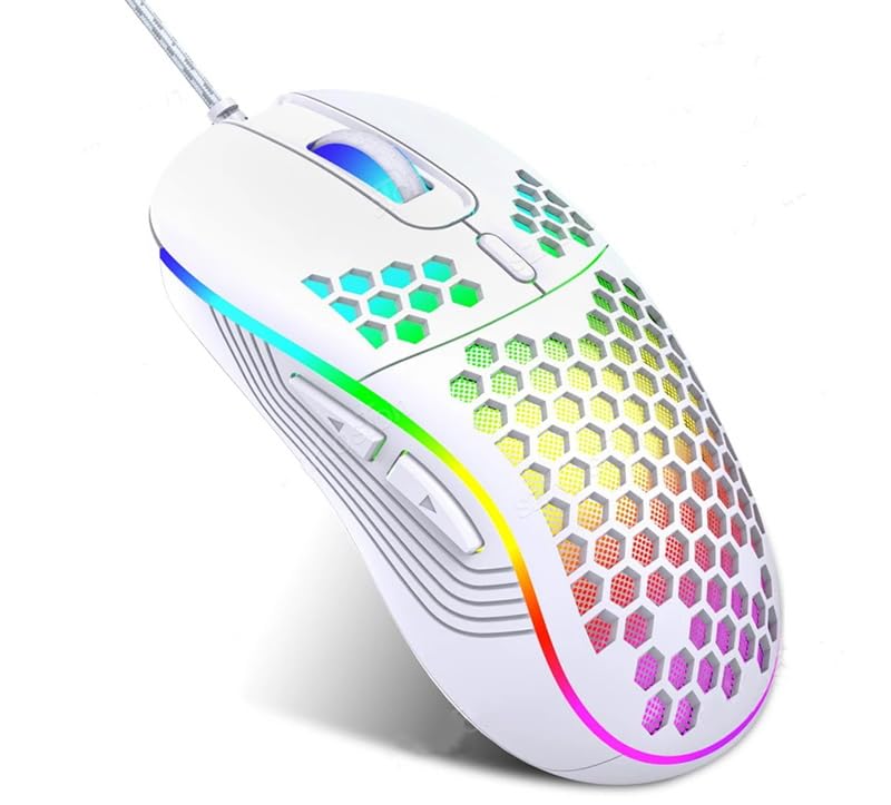 Generic - ماوس ألعاب سلكي 6D بإضاءة خلفية ليد ار جي بي ودقة قابلة للتعديل 800-1600-2400-3600 نقطة لكل بوصة وتصميم خفيف الوزن بشكل قرص العسل وكابل مضفر بطرف USB وطول 1.5 م ومريح للكمبيوتر واللاب توب (أبيض)