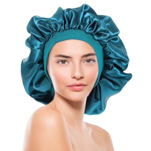 FOMIYES - فوميز. 2 قطعة بونيه شعر ساتان بحافة عريضة، بونيه شعر منتفخ للنوم للشعر المجعد، قبعة نوم من الساتان مع شريط راس للمكياج، قبعة طبخ مرنة