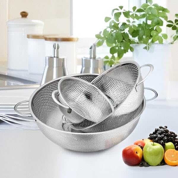 - مجموعة المصفاة المصنوعة من الستانلس ستيل هذه هي حل متعدد الاستخدامات 3 في 1 مصمم لتصريف المعكرونة والخضروات والفواكه. تصميمها متعدد الوظائف يجعلها أداة مطبخ أساسية لأي شخص يستمتع بالطهي وإعداد وجبات طازجة.
