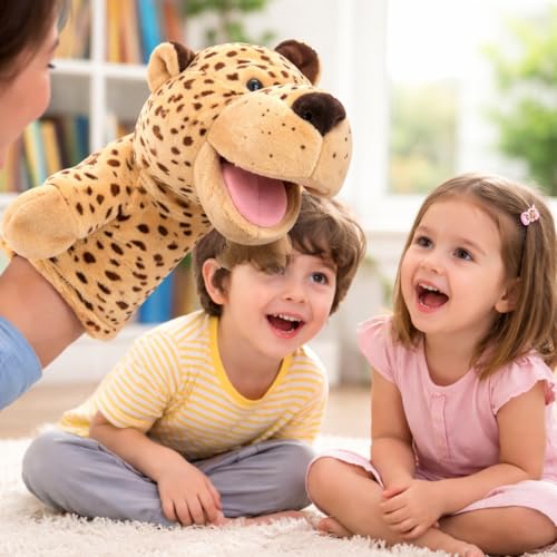 Generic - دمية يد من القطيفة الناعمة على شكل حيوانات الغابة مع اذرع فم متحركة لسرد القصص ولعب الادوار والتدريس في مرحلة ما قبل المدرسة والتعلم التفاعلي للاصدقاء، هدية عيد ميلاد ممتعة تعليمية (فهد)
