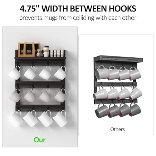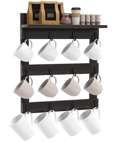 FoverOne - حامل أكواب قهوة يثبت على الحائط من الخيزران الطبيعي مع 12 خطاف ورف تخزين لتخزين المجات للمطبخ المنزلي من فوفر ون