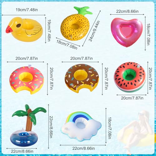 - محتويات العبوة: 8 حوامل أكواب قابلة للنفخ بتصميم مختلف لحمام السباحة سيلبي احتياجاتك في الصيف. 2 × دونات، 1 × بطيخ، 1 × رينبو، 1 × شجرة جوز الهند، 1 × بطة صفراء صغيرة، 1 × على شكل قلب، 1 × أناناس.
