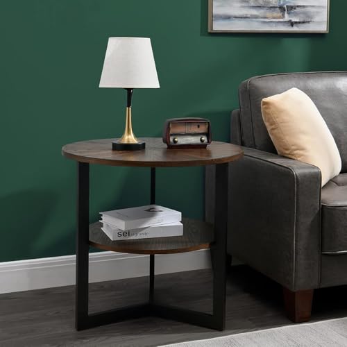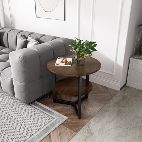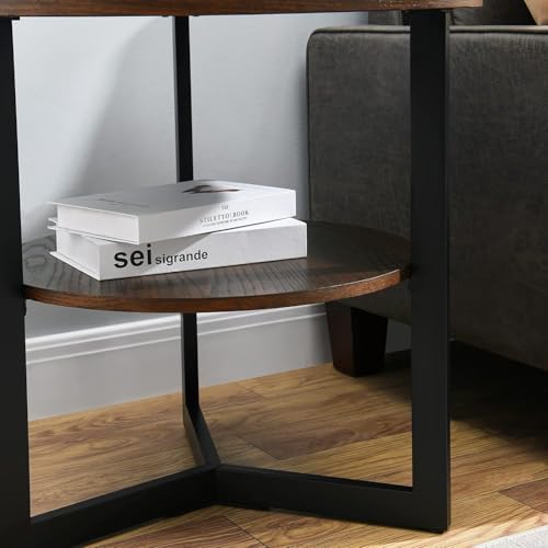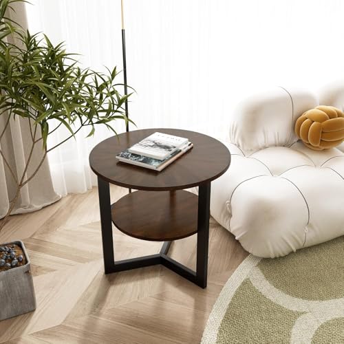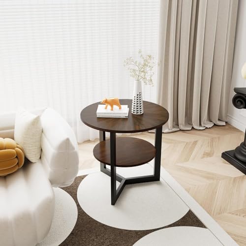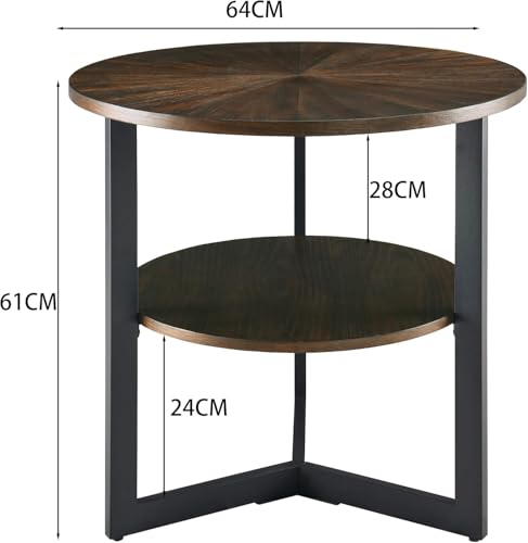 FurniFlex - طاولة قهوة جانبية دائرية ذات طابقين بأرجل معدنية من فورني فليكس، 64 سم × 64 سم × 61 سم، بني (لون خشب البلوط)/بني داكن