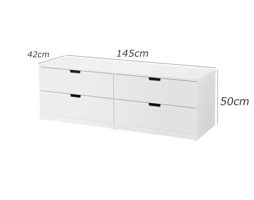 - وحدة ادراج مودرن ام دى اف - ارتفاع 50 سم - عرض 145 سم - عمق 42 سم ، تتكون من 4 ادراج ، مصنوعة من ال MDF عالي الجودة ، سُمك 16مم ، مع طبقة ملامين خارجية من اللون الأبيض المطفي. مع ميكنزم معدن (مجرة الدرج معدن 2 مرحلة) ، فنش عالي الجودة ، من فرنتشر ستور.