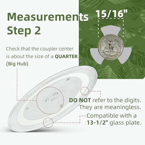 - لتجنب الانتظار دون جدوى لاستبدال خاطئ: 1) قم بقياس النقطة المركزية لوصلة القرص الدوار بقطر حوالي 15/16 انش (مقاس ربع دولار)، حتى تتمكن اللوحة من وضعها على عمود القرص الدوار. 2) قم بقياس الجزء الداخلي من الميكروويف لضمان ملاءمة لوحة زجاجية للميكروويف مقاس 13.5 انش