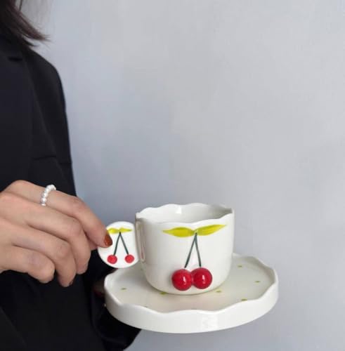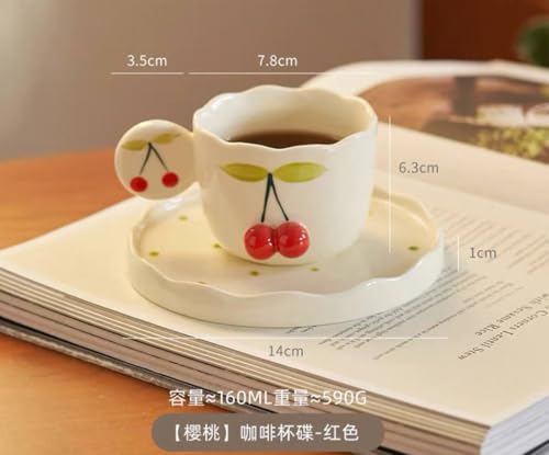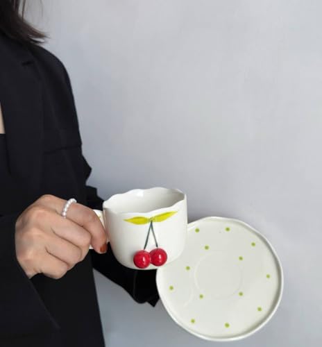 - تصميم أنيق: طقم كوب قهوة وصحن من السيراميك الأبيض يتميز بطباعة الكرز الساحرة مع الكرز الأحمر والأوراق الخضراء، يكمله تصميم متطور بحافة صدفية