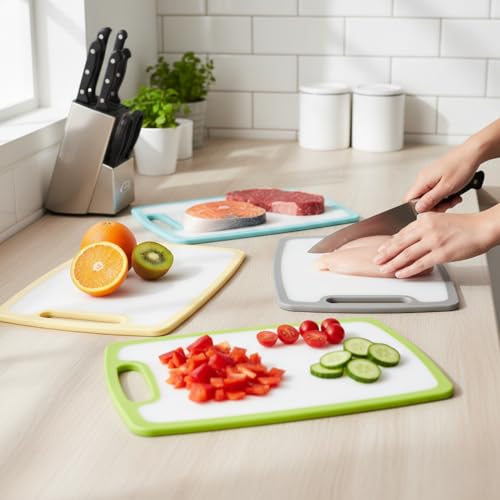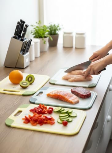 - تنظيم مرمز بالألوان: مجموعة من 4 ألواح تقطيع بألوان وأيقونات مميزة مخصصة للفواكه والخضروات والأسماك واللحوم لمنع التلوث المتبادل أثناء تحضير الطعام
