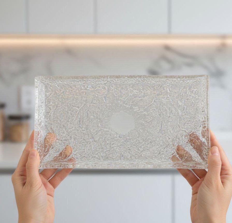 - تصميم أنيق: تتميز صينية التقديم المستطيلة المصنوعة من الزجاج الشفاف الكريستالي بنمط مزخرف متطور يضيف لمسة أنيقة وراقية إلى أي طاولة طعام أو عرض بوفيه