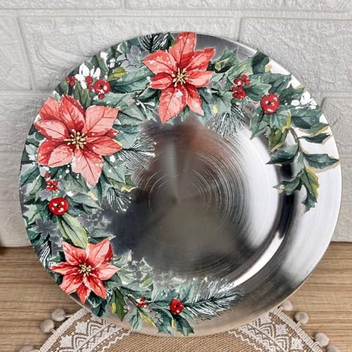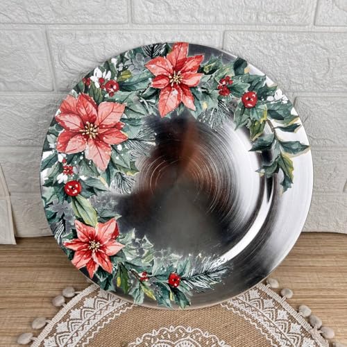 Generic - جيني طبق تقديم دائري مزخرف للعطلات، طبق شاحن بلاستيكي معدني 33 سم مع بوينسيتيا، بنمط زهور الكريسماس والشتاء، لون فضي