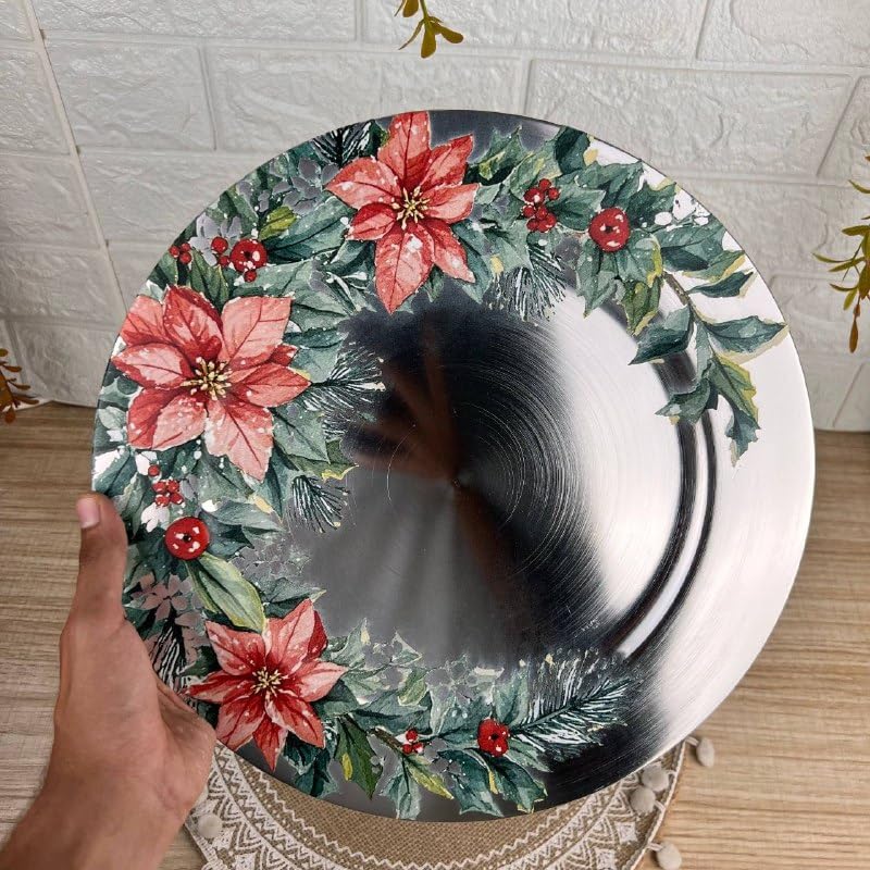 - ديكور موسمي: يتميز ببوينسيتيا حمراء نابضة بالحياة وأوراق هولي خضراء وتوت احتفالي مرتبة بنمط إكليل فني حول حافة الطبق