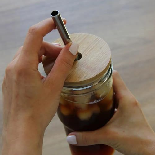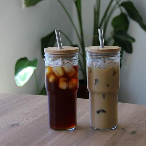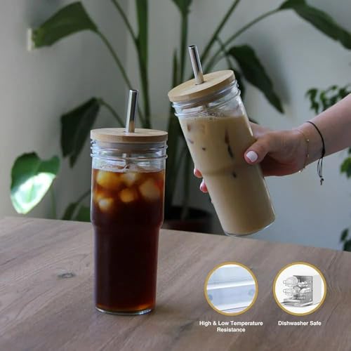 Generic - جيني طقم اكواب زجاجية بغطاء خيزران وماصة من الستانلس ستيل، 400 مل، للمشروبات الساخنة والباردة. دي بي