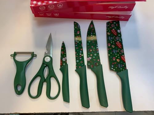 Generic - طقم سكاكين مطبخ مع مقصات ومقشرة، 6 قطع، أحمر بنقشة مبهجة بطابع العطلات (أخضر)