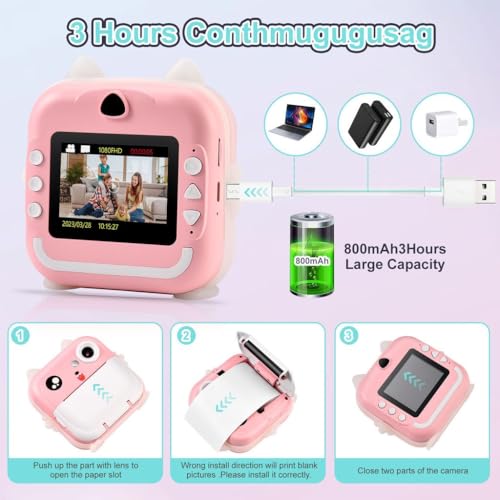 Generic - كاميرا صغيرة فورية للاطفال بدقة 1080P وورق طباعة بدون حبر لطباعة الصور والصور الفورية لعيد الميلاد، لون أسود