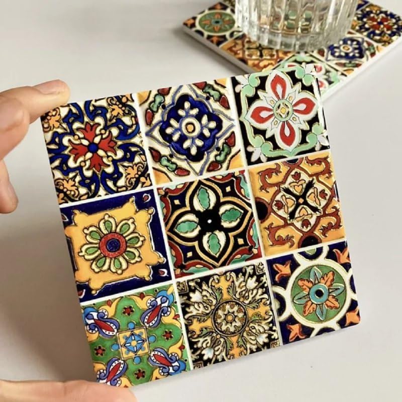 Generic - جيني قاعدة اكواب حرارية مربعة صغيرة مع ظهر جلدي، تصميم بلاط مزخرف، 10 × 10 سم .ام كيه