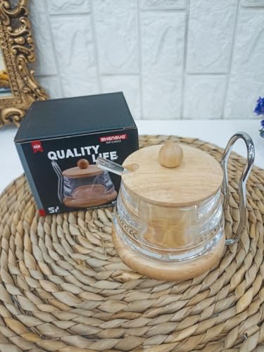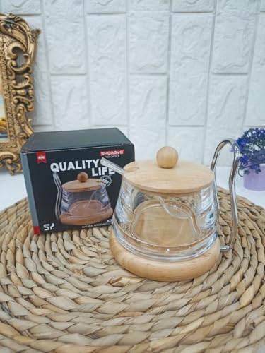 Generic - سكرية زجاجية بغطاء خشبي وملعقة وحامل قاعدة ومقبض معدني من شينيفا