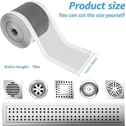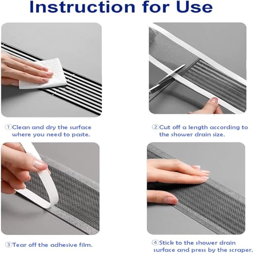 - طريقة الاستخدام: أولاً، قِس طول مصرف الدش؛ ثم قُص شبكة التقاط الشعر بالطول الذي تحتاجه؛ بعد ذلك، نظف المكان حول بالوعة الدش؛ وأخيرًا، أزل الغشاء الواقي والصق أداة التقاط الشعر بمحاذاة تصريف الأرضية. يمكنك تنعيم الأجزاء غير المتساوية في حال وجودها باستخدام مجرفة الإزالة.
