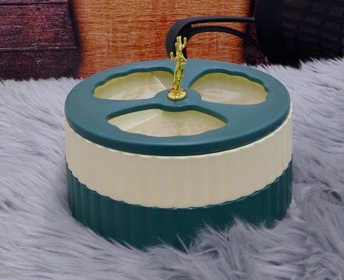 - التصميم: طبق تقديم مميز من طبقتين بلون أخضر وكريمي، مثالي لتقديم الحلويات والمكسرات