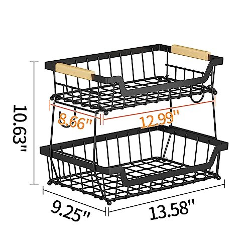 GILLAS - سلة فاكهة من طبقتين لسطح الطاولة المطبخ مع شماعتين للموز جيلاس منظم معدني قابل للفصل للخبز والخضروات والفواكه تأتي السلة بمقبض خشبي أوعية تخزين مستطيلة بسعة كبيرة لون أسود
